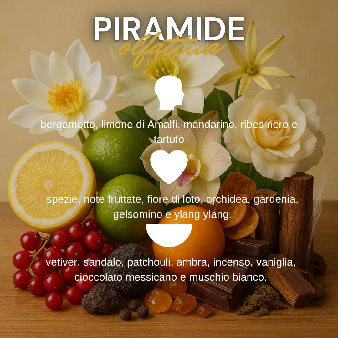 Lasciati ipnotizzare dall’apertura luminosa di bergamotto, limone di Amalfi, mandarino, ribes nero e un tocco intrigante di tartufo: un mix inaspettato che cattura i sensi e prepara il terreno per un cuore opulento e raffinato.