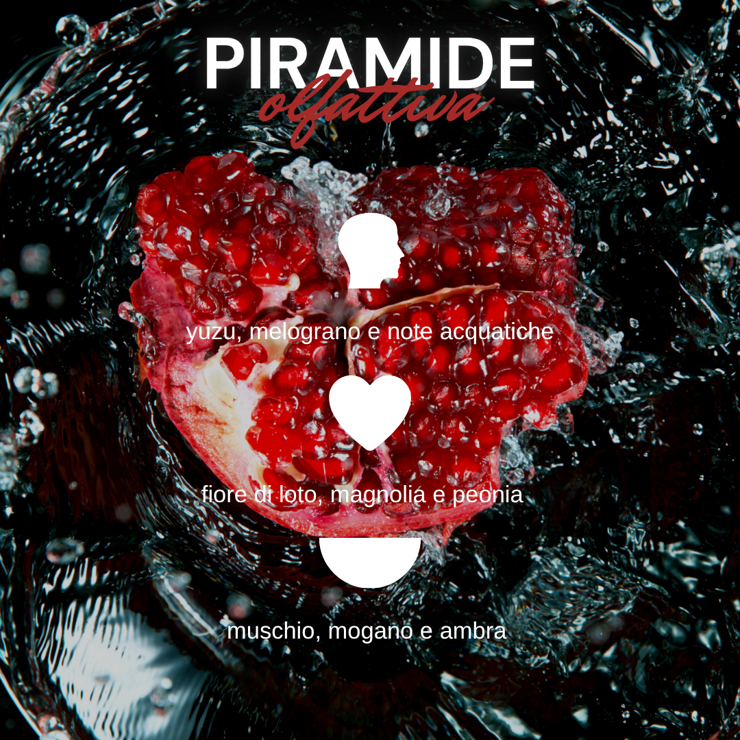La testa fresca e fruttata di yuzu e melograno cattura un cuore floreale di fiori di loto e peonia.