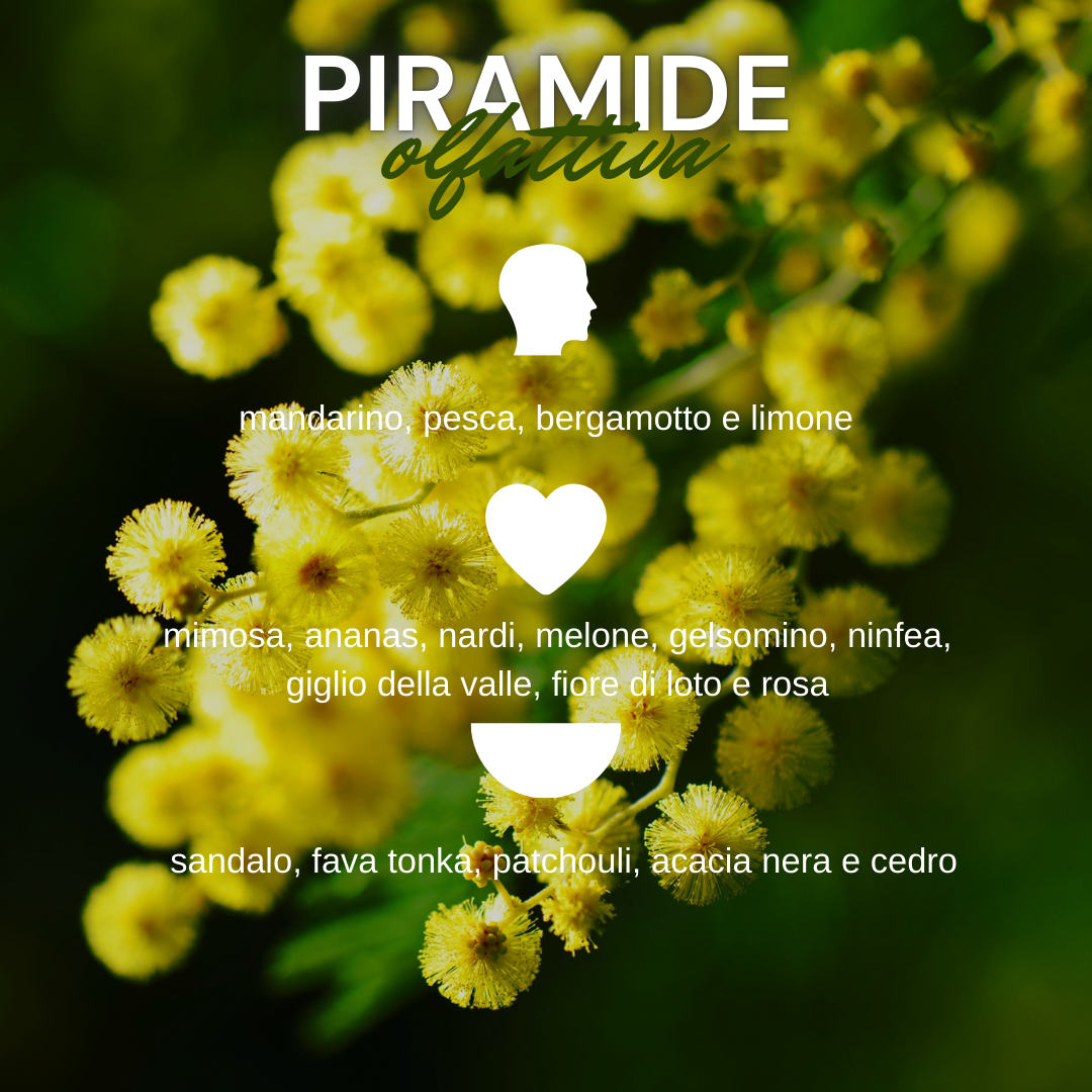L'apertura vivace di mandarino e pesca baciano cuore floreale di mimosa e gelsomino.