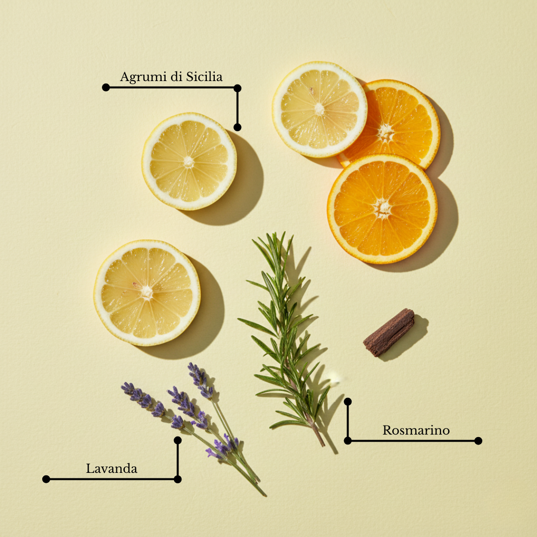 La fragranza contiene rosmarino, ambra, lavanda, agrumi siciliani, gelsomino, muschio bianco, rosa bulgara, citronella, vetiver, sandalo e patchouli.