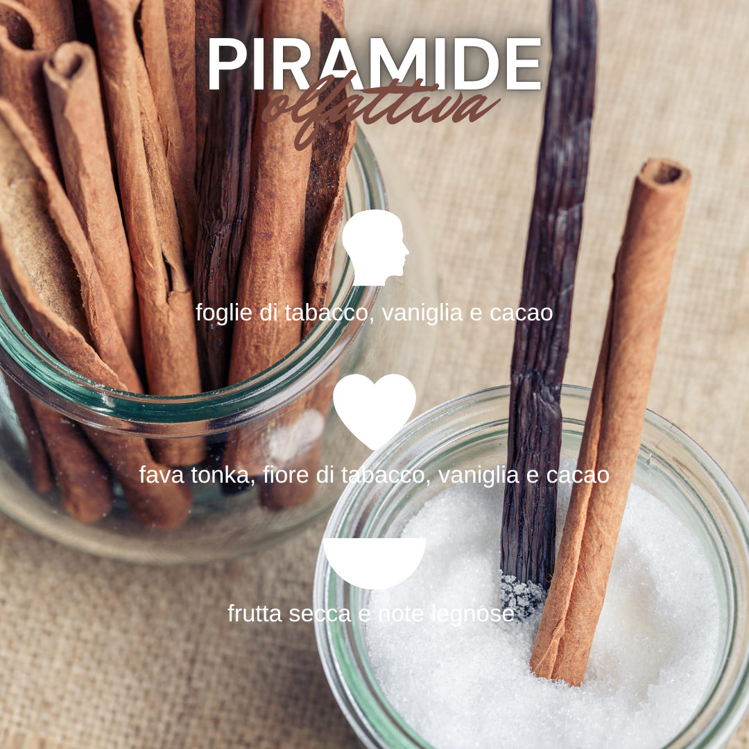 L'apertura intensa di foglie di tabacco si fondono con un cuore di vaniglia e cacao.
