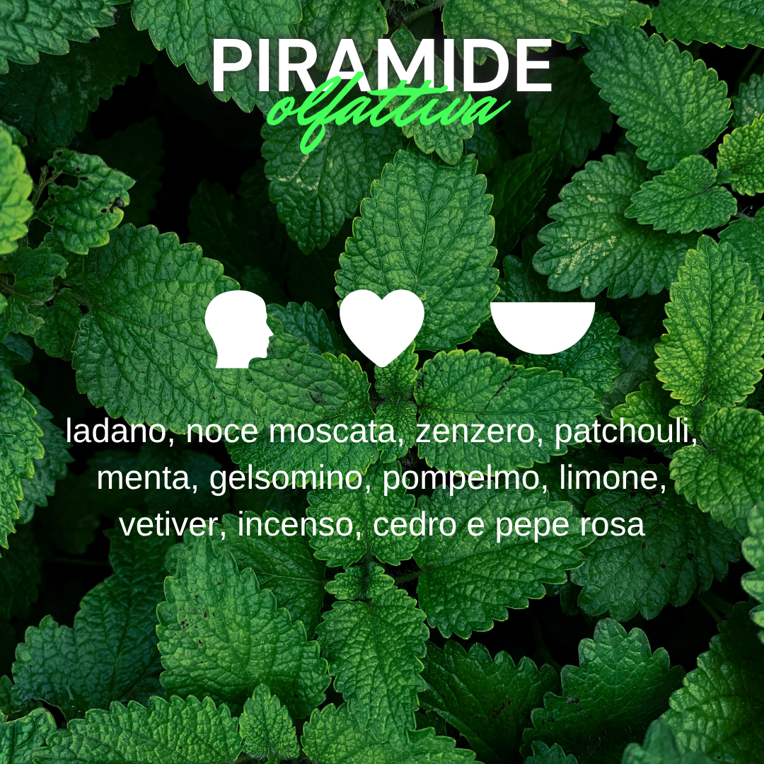 L'apertura fresca di agrumi e menta incontra un cuore speziato di zenzero e noce moscata . Il fondo di legni pregiati e patchouli chiude con determinazione la fragranza, creando un sentore che evoca l'essenza di uno stile di vita sofisticato.