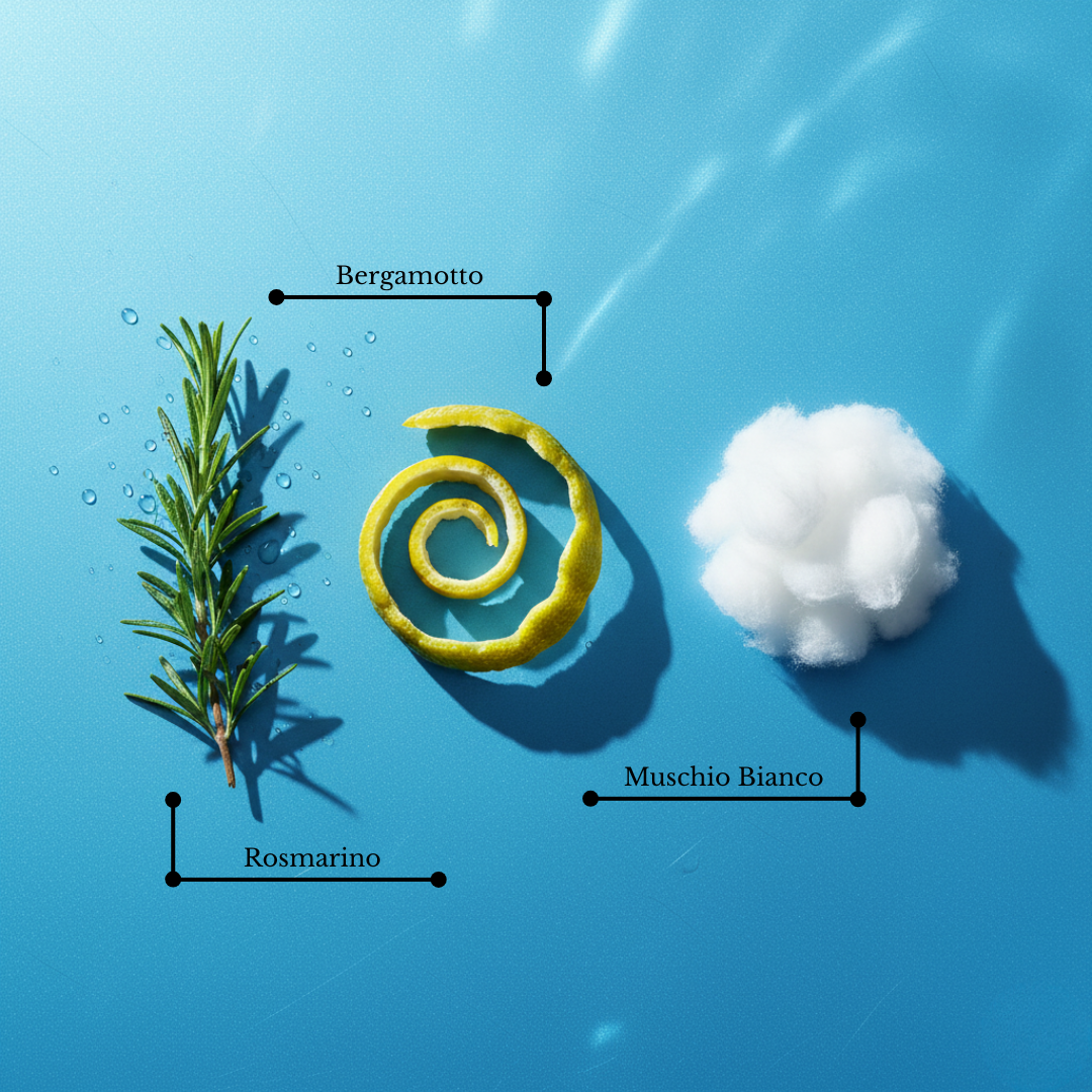 Trasmette una serenità radiosa e una vitalità rinfrescante, ispirandosi alla luce azzurra del Mediterraneo. Il suo carattere comunica un'eleganza moderna e pulita, capace di infondere ottimismo e forza. È l'essenza ideale per chi vive la quotidianità con dinamismo, lasciando una scia di energia pura e di raffinata sobrietà.