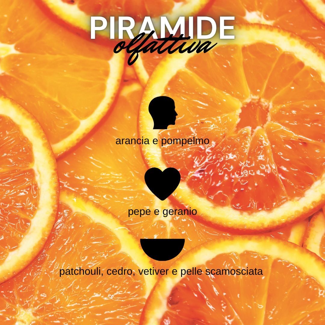 L'apertura vivace di arancia e pompelmo accende la fiamma ardente di questo profumo, seguiti da un cuore di pepe e geranio che dona emozioni selvagge.