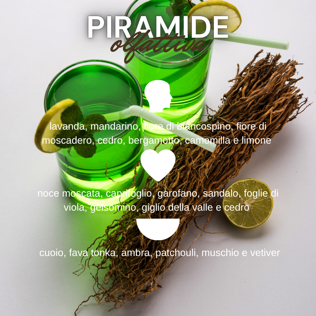 Le note di fondo di cuoio e vetiver conferiscono una virilità sensuale e intrigante, creando un bouquet olfattivo unico nel suo genere.