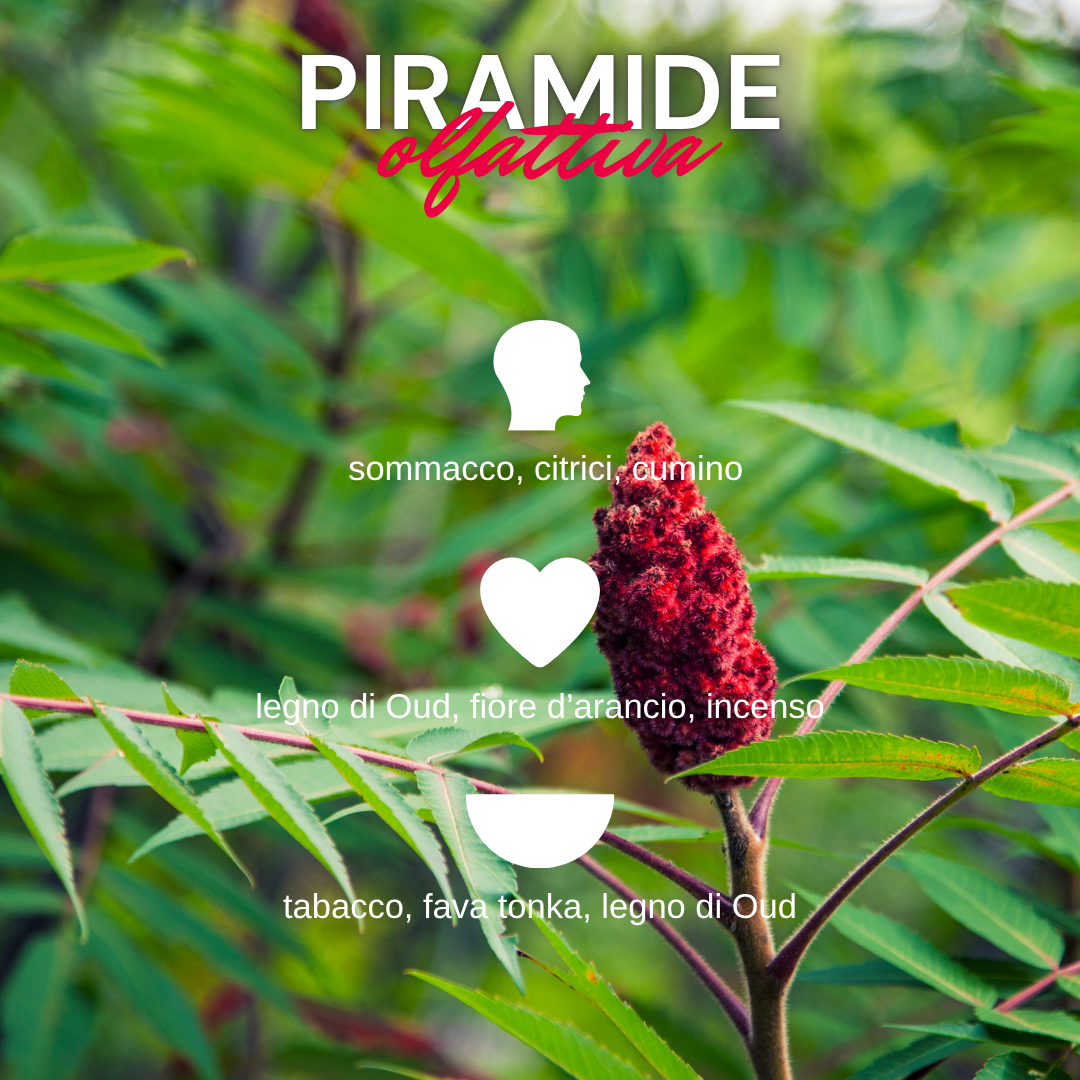 L'apertura intensa di sommacco e cumino ti fa entrare nei meandri della foresta, trovando relax nel cuore della fragranza con la ricchezza dell'oud e dell'incenso .