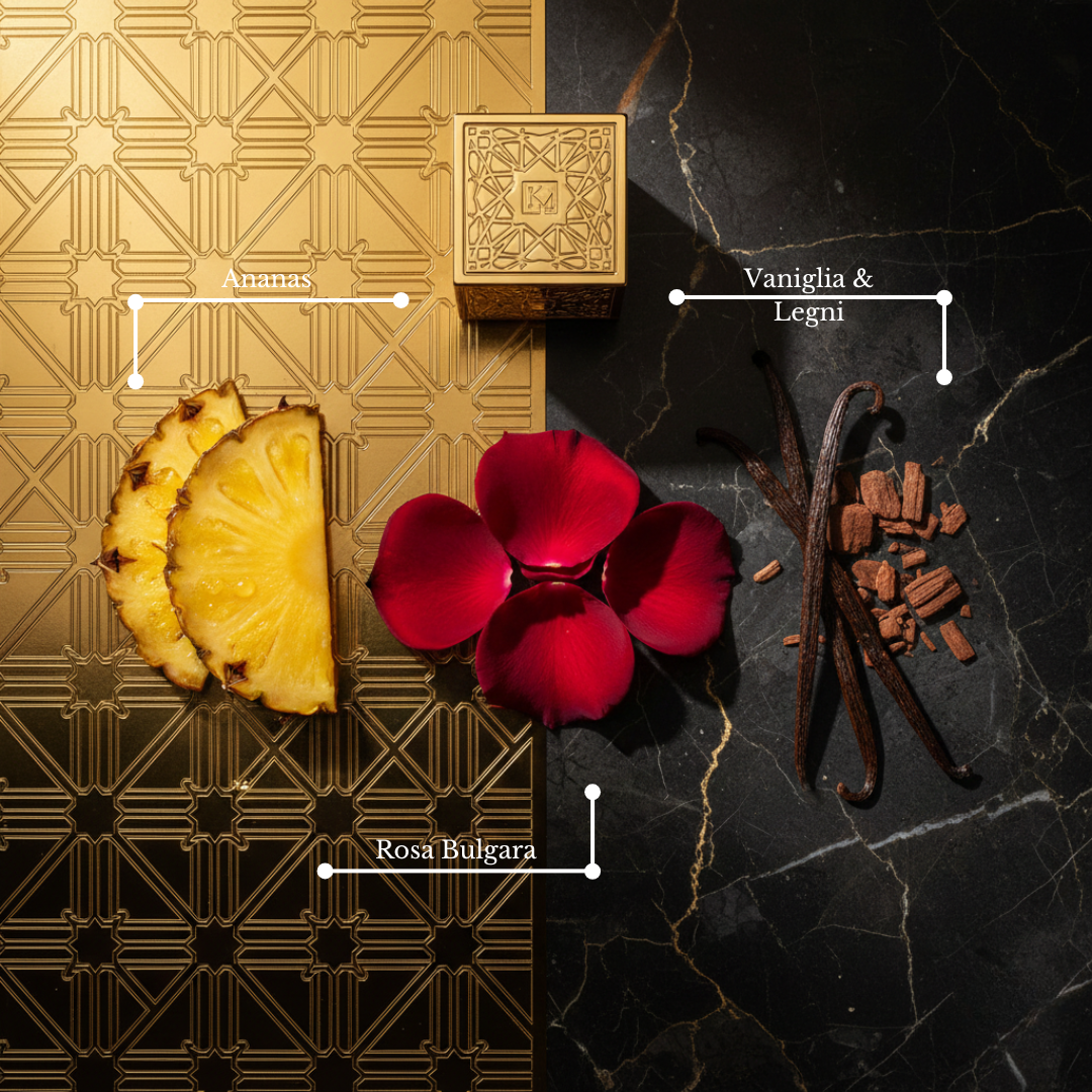 Testa: ananas, bacche rosse, mela, cardamomo, coriandolo