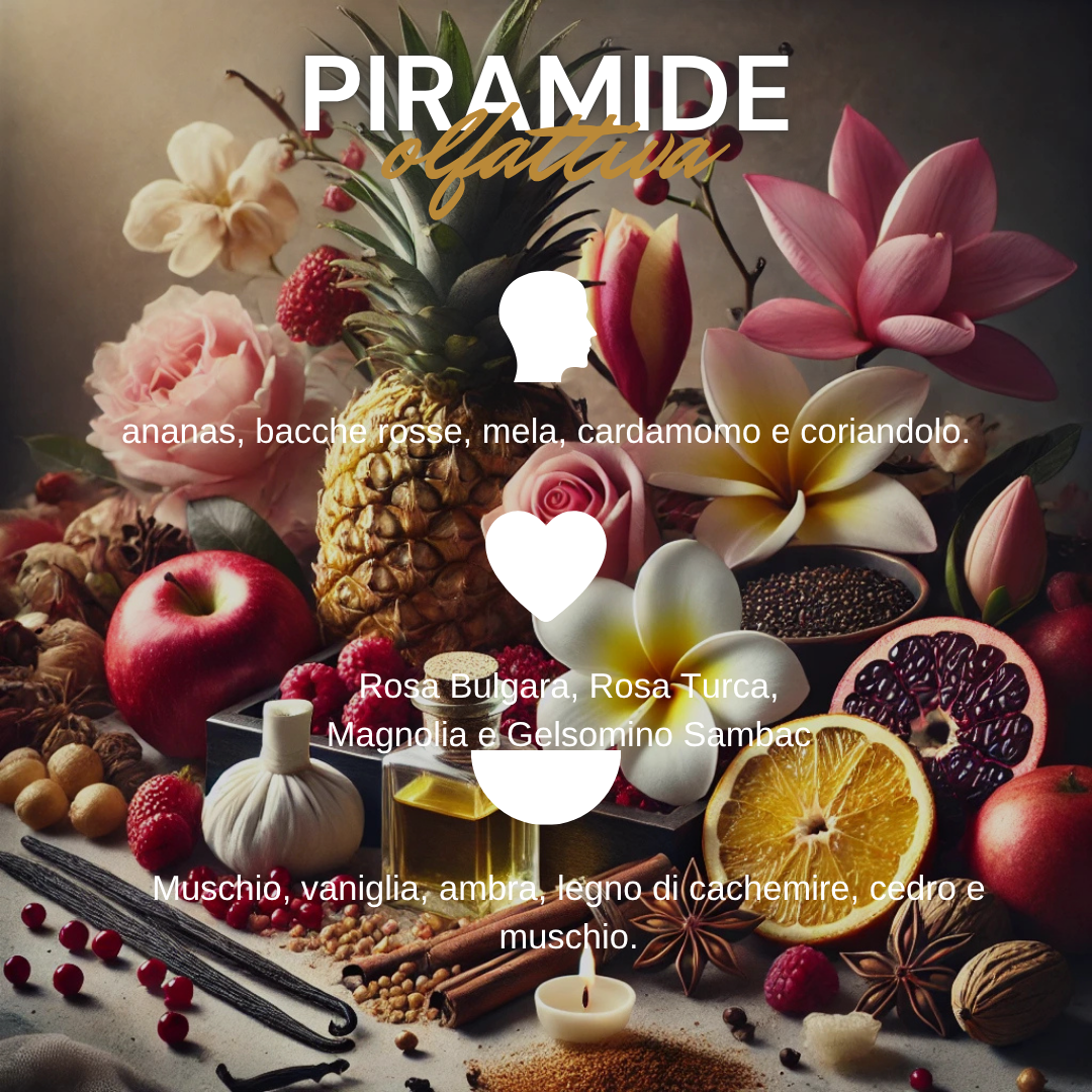 Lasciati fragranza che incarna il fascino di terre lontane, tra opulenza e mistero, avvolgendo i sensi in un’esperienza olfattiva calda e irresistibile.