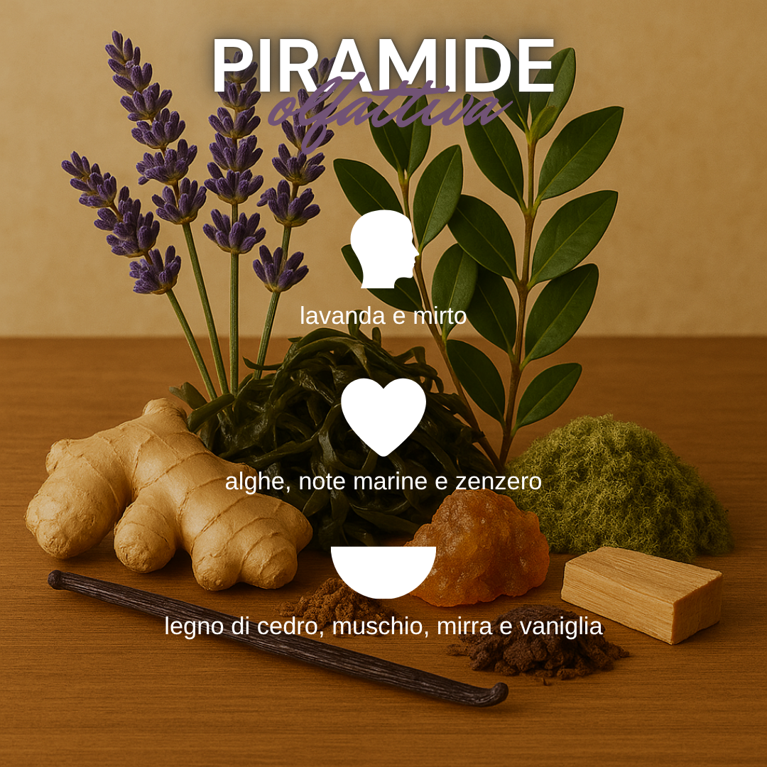 Nel cuore, le note marine si fondono con le alghe e un tocco speziato di zenzero, creando un accordo minerale, salino e vibrante, come una brezza che arriva dal mare aperto. Il fondo legnoso e avvolgente di cedro, muschio, mirra e vaniglia aggiunge profondità, calore e spiritualità, lasciando una scia elegante e fuori dagli schemi.