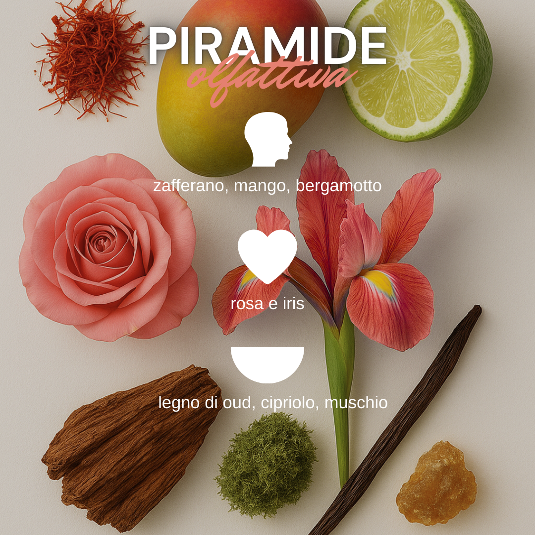 Lasciati avvolgere dalle note frizzanti e speziate di zafferano, mango e bergamotto, un’apertura brillante e vibrante che cattura subito l’attenzione e stimola i sensi con energia e carattere.