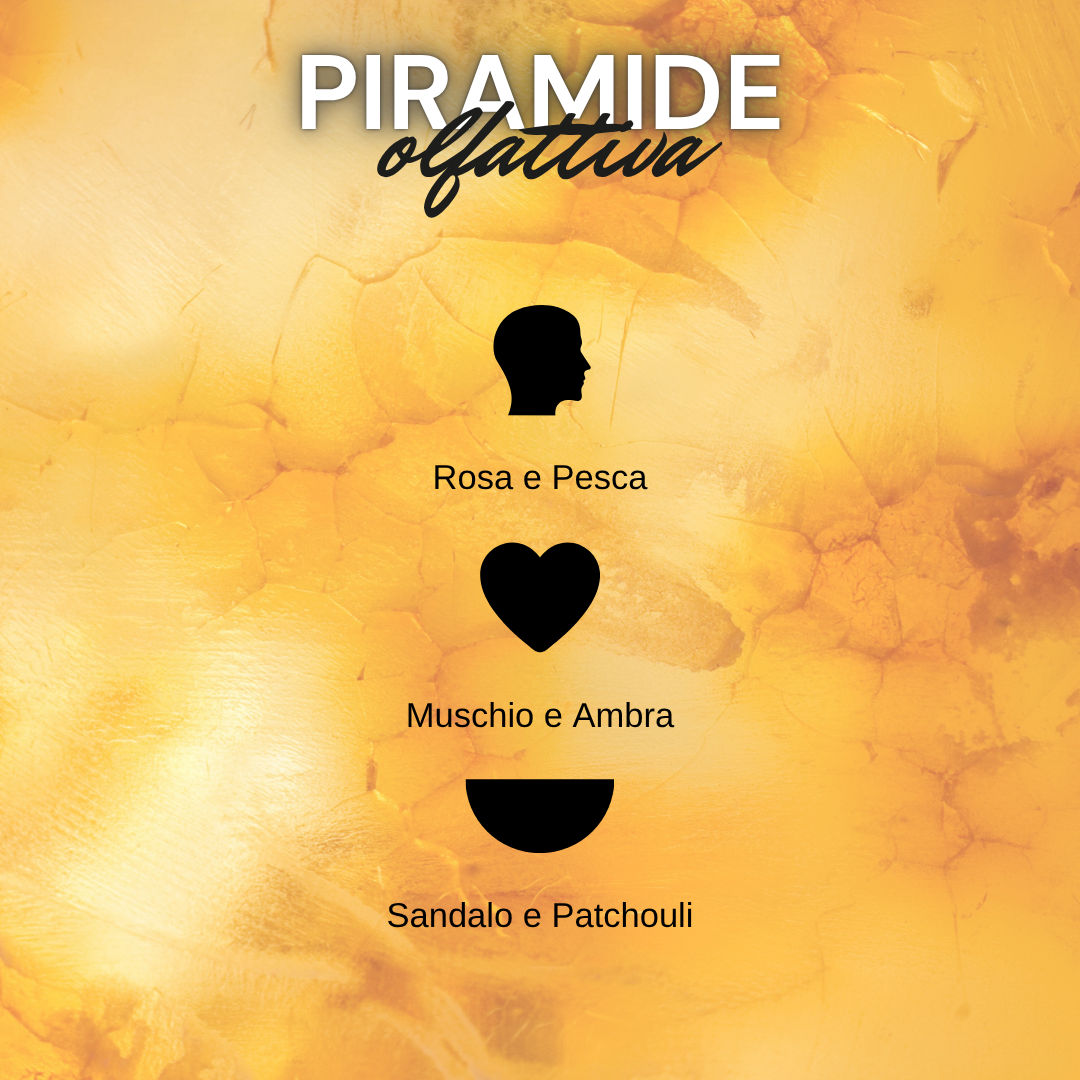La base di Sandalo e Patchouli chiudono con sensualità questa fragranza evocando sentimenti che rivelano i toni morbidi e caldi della pelle baciata dal sole.