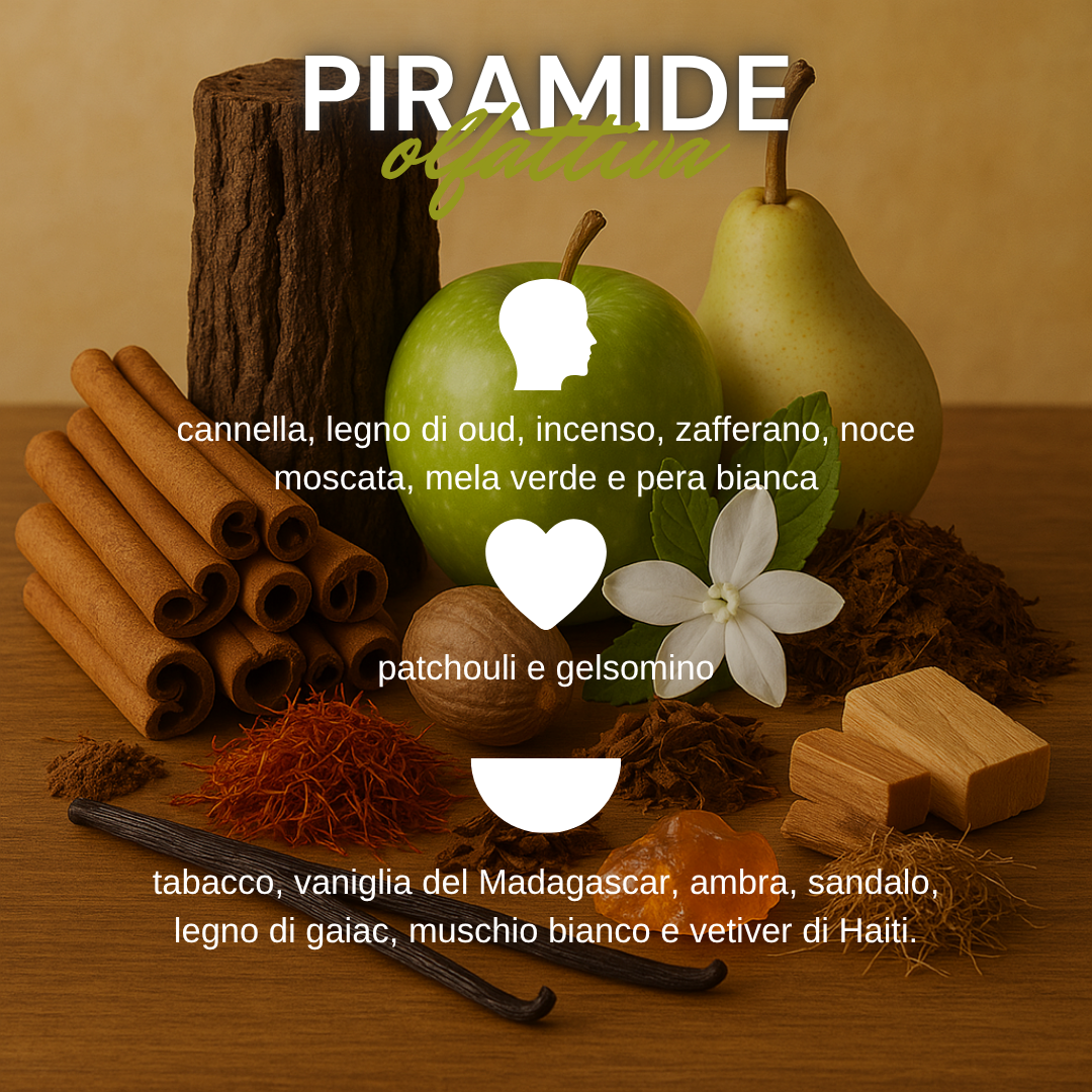Lasciati travolgere dalle note di testa: un'apertura audace dove cannella, legno di oud, incenso e zafferano si intrecciano con la dolcezza speziata della noce moscata e la freschezza fruttata di mela verde e pera bianca.