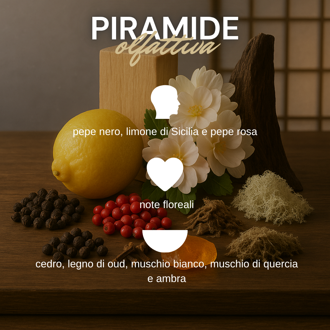 Lasciati colpire dall'esplosione iniziale di pepe nero, limone di Sicilia e pepe rosa: un'apertura pungente e agrumata che risveglia i sensi con energia e grinta, come una scintilla che accende tutto ciò che tocca.